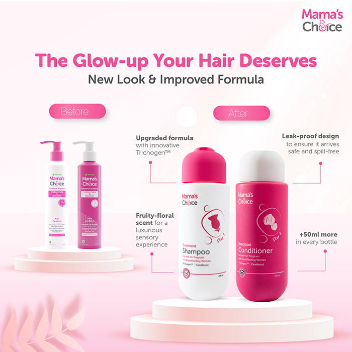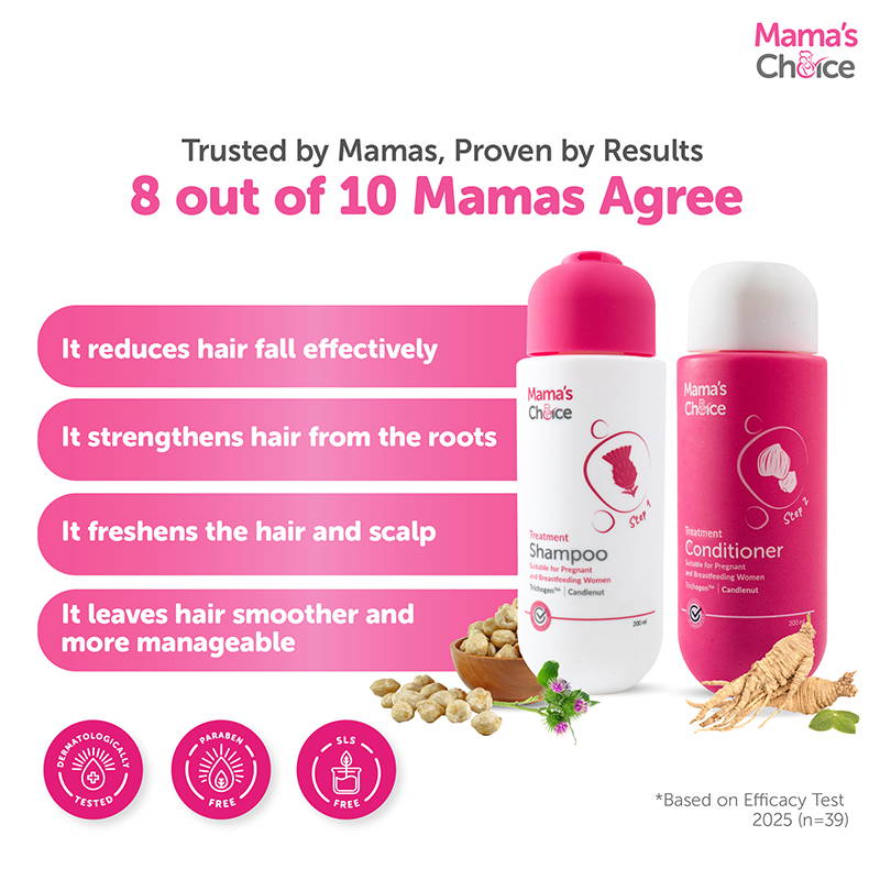 Experience our improved Mama’s Choice Anti Hair Loss Series, featuring the Treatment Shampoo and Conditioner, now with a new look and upgraded formula! Specially made for pregnant and breastfeeding mamas, this gentle yet effective duo helps reduce hair loss, strengthen weak strands, and restore your hair’s natural softness and shine. Formulated with Trichogen™, Candlenut, and Ginseng Extracts, it works from root to tip to promote healthy hair growth and revitalize your scalp so your hair feels as strong and beautiful as you are.
